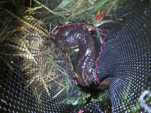 短い時間でしたが、2頭も確認できました。2頭とも以前調査で捕獲され、マイクロチップが埋めてあった個体でした。1頭目は体長約40cm。2頭目は体長約77cmの大物でした。2頭目は生徒が発見して捕獲したものでした。