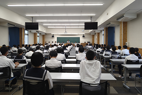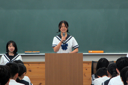 9月26日(木)の全校集会で新旧生徒会執行部が挨拶をしました。