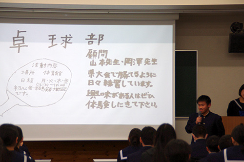 生徒会を中心に委員会や部活、先生紹介を行い、その後1年生は4班にわかれて部活見学をしました。