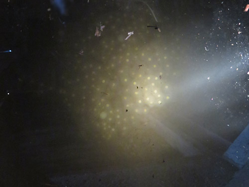 人工巣穴の観察では、今日の雨で川が増水し人工巣穴の水が濁っていましたが、約1000個の卵とそれを守るヌシ(オオサンショウウオのボス)の姿を観察することができました。