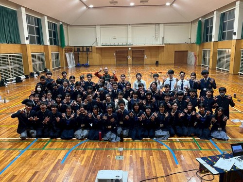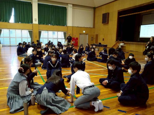 そして、JICAの体育館に移動し、興南中学・高校のアクト部のみなさんの歓迎を受けたあと、両校ミックスの8グループに分かれて、これまでの平和学習をお互いに振り返り、沖縄・広島の相違点を一緒に考えました。平和のあり方だけでなく、ものの見方・考え方についても学びました。