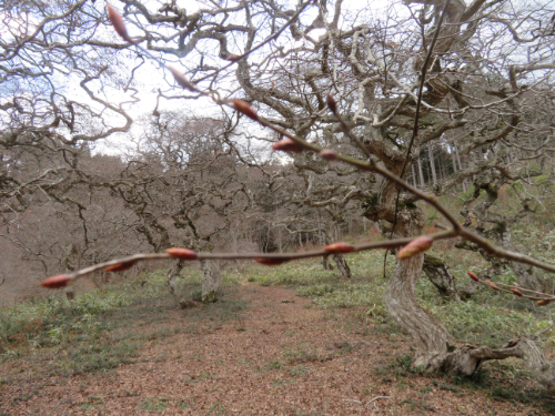 テングシデたちの枝の先は大きく膨らみ、芽吹きの準備をしています。気がつきにくいのですが、膨らみは2種類あります。少し小さい方が葉で、大きい方が雄花になります。雌花は雄花に遅れて芽吹きます。時間差があるのは面白いですね。
